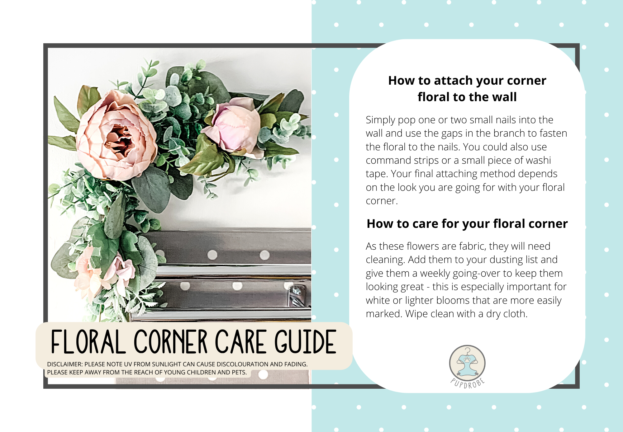 Progress GUIDES AND INSTRUCTIONS Complete & Continue Next Lesson Learn More PUPDROBE GUIDES AND INSTALLATION 7 Lessons Care Guide Installation Guide Add On Rail Board Installation Guide Jar Storage Care Guide Travel Pupdrobe Care Guide Copawdinated Collection Care Guide Cosy Collection Care Guide ACCESSORIES CARE GUIDES 9 Lessons Ceramic Dog Bowl Care Guide Cosy Comforter Care Guide Floral Corner Care Guide Framed Quote Print Care Guide Hanging Basket Care Guide Luxury Dog Bed Care Guide Quilted Blanket Care Guide Set of 3 Canvas Prints Hanging Rainbow Care Guide GUIDES AND INSTRUCTIONS Complete & Continue Next Lesson Learn More ACCESSORIES CARE GUIDES Floral Corner Care Guide
